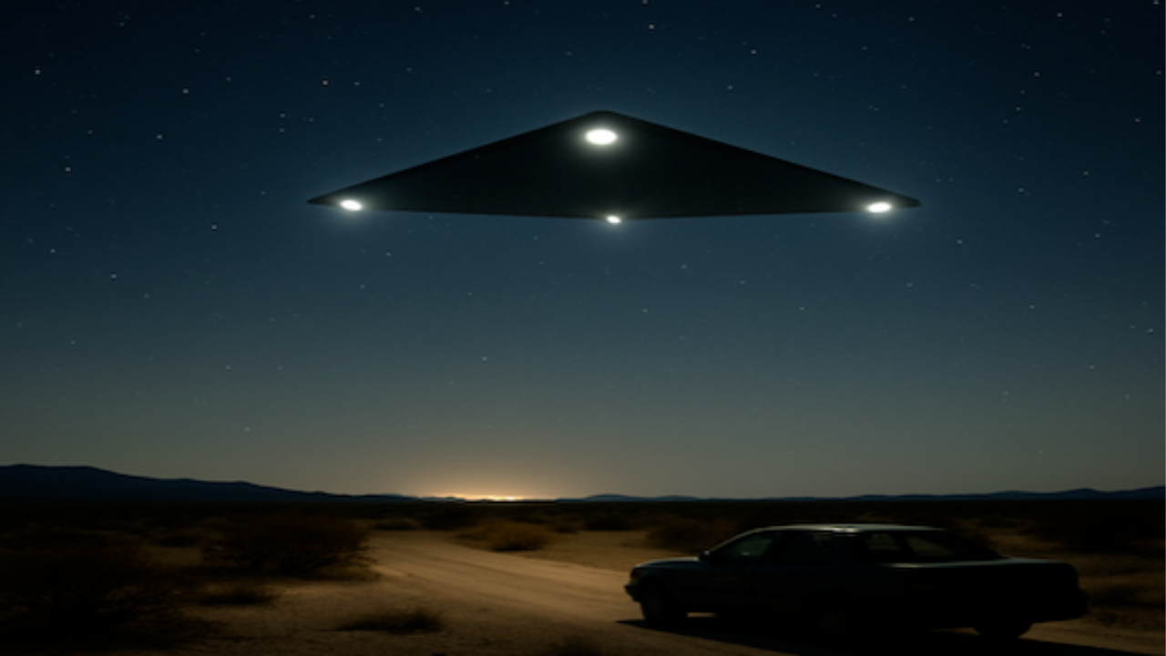 It was around 10:30 p.m. when the group turned off the main road and followed a dirt track through open desert. Inside the car were four friends: James, his friend who was driving, and a couple named Heather and Jamie. Ahead of them, a flashing light appeared, growing brighter as they approached until it stopped moving completely. Hovering roughly thirty feet above the ground was a massive triangular craft, estimated to be the size of three football fields. Rows of windows lined its sides, some glowing softly, others dark. A steady heat radiated from beneath it, strong enough to feel through the car doors.